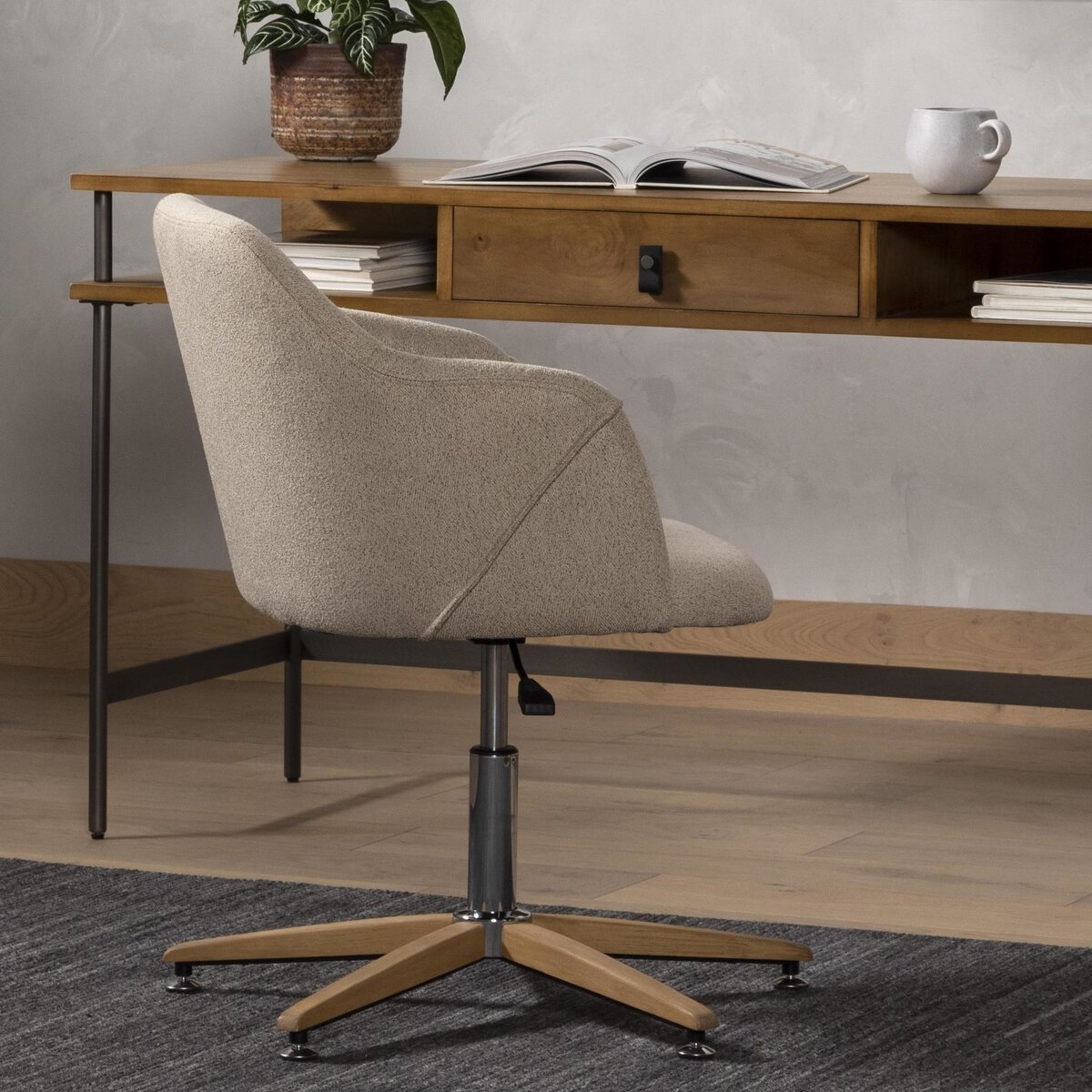 Made for the modern office. Finely tailored seating of high-performance fabric curves in all the right places for total comfort in the workplace. A five-star steel and beech wood base offers height adjustability for added ease.