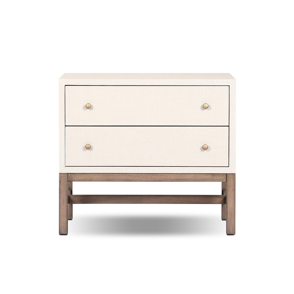 Woven ivory raffia offers a texture-driven take on bedside storage. Antique brass-finished iron hardware adorns dual drawers supported by a solid mahogany base.